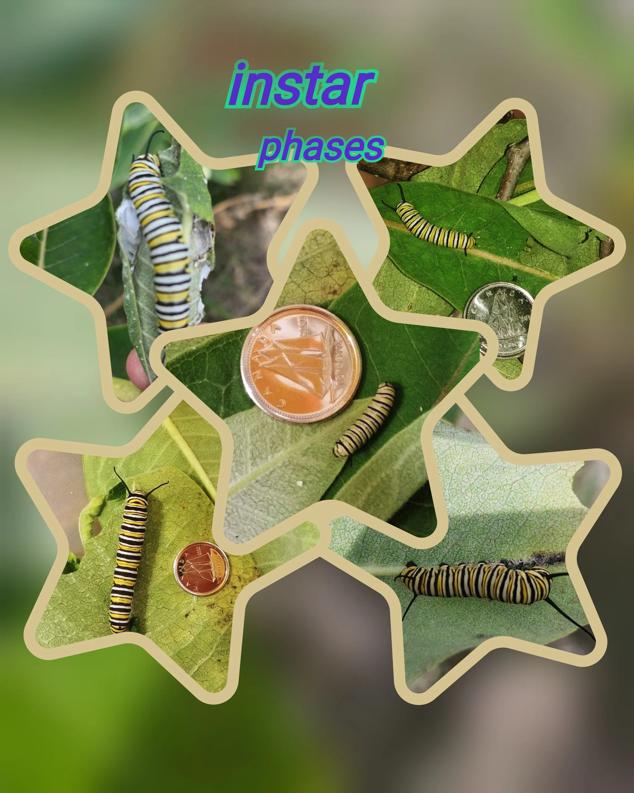 The monarch caterpillar in different stages of development, known as instar and categorized using a scale of 1 to 5.